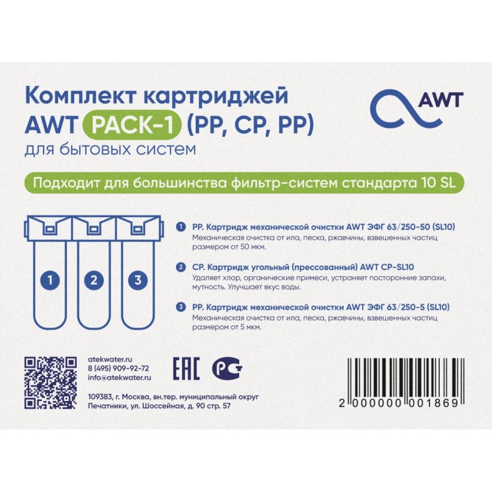 Комплект картриджей AWT PACK-1 для фильтров обратного осмоса – это три картриджа предназначенные для предварительной подготовки воды перед мембраной в бытовых фильтрах обратного осмоса. Использование картриджей комплекта позволяет снизить содержание в водопроводной воде примесей, которые сокращают срок службы мембраны, таких как хлор, хлорорганические соединения и механические примеси. После предварительной трехступенчатой очистки вода направляется на мембрану. Таким образом, картриджи предварительной фильтрации не только частично очищают воду, но и предохраняют мембрану от дополнительных нагрузок и повреждений.